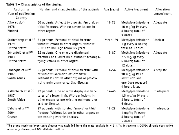 The studies showed that the severity of the fractures was similar in the corticosteroid group and in the control group. Two studies quantified the severity of the fractures by using a scale.(20,23) In the study conducted by Schonfeld et al.,(20) femoral fracture was given a score of 4, whereas other types of fracture were given scores of 2 (for fractures of the femoral neck, pelvis, or tibia) or 1 (for fractures of the fibula). The mean score in the corticosteroid group was 4.19, compared with 4.49 in the placebo group.(20) In the study conducted by Stoltenberg et al.,(23) femoral fracture received a score of 2, tibial fracture received a score of 1, and other types of fractures received a score of 0.2. Patients in the corticosteroid group presented a mean score of 1.75, whereas those in the control group presented a mean score of 1.46. In that study, patients with femoral fracture were submitted to internal fixation 7 to 10 days after the fracture, when the criteria for the insertion of the intramedullary pin were met.(23)