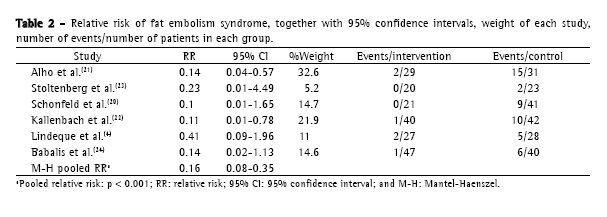 We performed a statistical analysis of two outcomes: FES and hypoxemia. However, we also reported the rates of complications and mortality in the studies. óThere was a variation in the definition of FES, although all of the studies considered one or more of the following clinical findings for the diagnosis: petechiae, respiratory failure/hypoxemia, and mental confusion. Lindeque et al.(4) proposed new diagnostic criteria based only on respiratory failure, but they also reported their results using a combination of the findings above. For the sake of uniformity, we used the results generated by a combination of the clinical findings described above. Hypoxemia was analyzed as a binary variable, and it was defined as what the authors of the clinical trials considered severe hypoxemia. Arterial oxygen tension <60 mmHg was the criterion used in four studies.(4,20,21,24) Two other studies used different criteria and were therefore excluded from the hypoxemia analysis.(22,23)