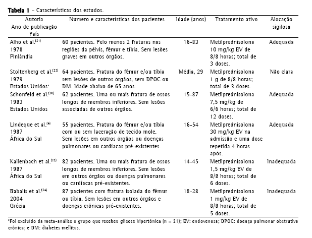 No estudo de Babalis et al., que analisou pacientes com fraturas isoladas fechadas ou abertas grau I da tíbia e fêmur, 87 pacientes sofreram um total de 19 fraturas fechadas do fêmur, 41 fraturas fechadas da tíbia, 10 fraturas abertas do fêmur e 17 fraturas abertas da tíbia. Todas as fraturas do fêmur foram tratadas com inserção de pino intramedular entre 4 e 12 dias após o trauma.(24) No estudo de Kallenbach et al., 82 pacientes sofreram um total de 55 fraturas do fêmur, 33 fraturas da fíbula/tíbia, 7 fraturas da tíbia, 1 fratura da fíbula e 28 fraturas em outras localizações; 72% dos pacientes submeteram-se à cirurgia nos primeiros 5 dias após o trauma.(22) O estudo de Lindeque et al. analisou pacientes com fratura do fêmur e/ou tíbia com ou sem contusão e laceração de tecido mole, e as fraturas abertas e fechadas foram divididas igualmente entre os grupos do corticosteróide e controle.(4) No estudo de Alho et al., a freqüência média de fraturas da extremidade e pélvis foi 2,5 por paciente, e a maioria dos pacientes sofreu fratura do fêmur.(21)