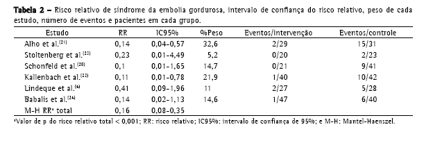 Analisamos estatisticamente dois desfechos: SEG e hipoxemia. No entanto, também narramos as complicações e mortalidade ocorridas nos estudos. Houve uma variação na definição de SEG, embora todos os estudos tenham considerado um ou mais dos seguintes achados clínicos para o diagnostico: petéquias, insuficiência respiratória/hipoxemia e confusão mental. Lindeque et al.(4) propuseram novos critérios diagnósticos baseados somente na insuficiência respiratória, mas relataram também os seus resultados usando uma combinação dos achados acima. Para uniformidade, utilizamos os resultados que foram gerados por uma combinação dos achados clínicos descritos acima. A hipoxemia foi analisada como uma variável binária, sendo definida por aquilo que os autores dos ensaios clínicos consideraram como hipoxemia grave. Uma pressão parcial de oxigênio <60 mmHg foi o critério utilizado em quatro estudos.(4,20,21,24) Outros dois estudos utilizaram critérios diferentes e, portanto, não foram incluídos na análise da hipoxemia.(22,23)