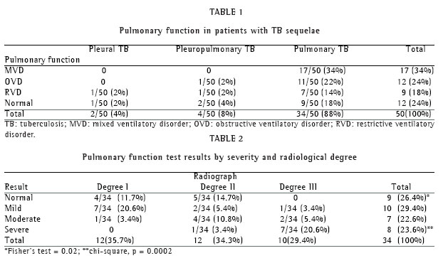 Objective: To describe data related to the pulmonary function of patients with sequelae of pulmonary tuberculosis, pleural tuberculosis or both. Methods: In the outpatient clinic of a university hospital, 218 patients were evaluated. Of those 218, 56 had sequelae of tuberculosis (pulmonary, pleural or both), and 162 had other types of tuberculosis. All patients were evaluated in the pulmonary function laboratory between February 2000 and July 2004, and 43 were found to be eligible for inclusion in the study. Patients with a history of asthma, chronic pulmonary obstructive disease, cardiac insufficiency, collagen diseases, silicosis or thoracic surgery, as well as those for whom spirometry yielded unacceptable results or was not performed, were excluded. The lung fields were divided into six zones, and radiographic results were classified by degree: I (involvement of only one zone with no cavitation); II (involvement of two or three zones or of one zone with cavitation); or III (extensive involvement of three or more zones with or without cavitation). Results: The final study sample comprised 50 patients, 44 (88%) of whom had pulmonary tuberculosis. The most prevalent form (17/50; 34%) was mixed ventilatory disturbance. Severe disturbances were more significant in degree III radiographs (p = 0.0002) and normal pulmonary function was predominant among patients presenting degree I and II radiographs (p = 0.002). Conclusion: The early discovery and treatment of tuberculosis contribute to reduce the number of cases, as well as the incidence of tuberculosis sequelae, thereby improving the quality of life of tuberculosis patients. Further studies, involving longitudinal, sequential analysis and larger samples of patients with tuberculosis sequelae, should be conducted in referral centers in Brazil.