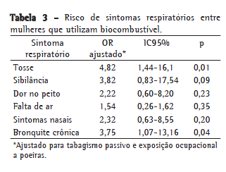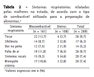 (14,15) De acordo com um grupo de autores,(16) os indivíduos tendem a escolher fontes de energia melhores e mais seguras à medida que a condições socioeconômicas melhoram. Nossos resultados também mostram que os sintomas respiratórios (tosse, sibilância, dor no peito, falta de ar e sintomas nasais) e a bronquite crônica foram mais comuns nas mulheres que utilizavam biocombustíveis do que naquelas que não os utilizavam. Esse achado é semelhante aos de outros estudos.(16-20)