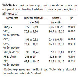 Entre as 79 mulheres que apresentaram resultados espirométricos confiáveis, todas as medidas foram menores naquelas que utilizavam biocombustíveis do que naquelas que não os utilizavam. Essas diferenças foram significativas para todos os parâmetros espirométricos, exceto para relação FEV1/CVF e PFE. Nossos achados são semelhantes aos de estudos realizados no Equador e na China, nos quais a redução da função pulmonar em crianças se associou a exposição à poluição do ar interior devido à queima de biocombustíveis.(23,24) Os efeitos da fumaça dos biocombustíveis sobre a função pulmonar, assim como sua associação com as doenças pulmonares restritivas e obstrutivas, em adultos estão bem documentados.(25-28) Em modelos animais, a exposição a material particulado tóxico foi associada a diminuição da complacência pulmonar e redução da resposta ventilatória.(2,16) O uso de biocombustíveis para a preparação de alimentos é descrito como uma fonte de prazer para muitas mulheres, e até como uma paixão para algumas; infelizmente, é um conhecido perigo para a saúde.(29)