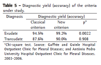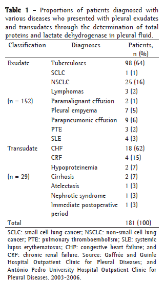 In the present study, we applied the classical criterion (that proposed by Light et al.) to a sample of patients being treated at two university hospitals in the state of Rio de Janeiro, Brazil (the Fluminense Federal University Antônio Pedro University Hospital; and the Federal University of the State of Rio de Janeiro Gaffrée and Guinle University Hospital), between 2003 and 2006, with the principal objective of studying the diagnostic parameters of the criterion for discrimination between pleural exudates and transudates.