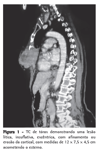 Paciente feminina, 74 anos, caucasiana e do lar. Referia investigação inicial, em outro serviço, por queda da própria altura há dois meses, cujos exames revelaram tumor em osso esterno. Apresentava dor constante, localizada, sem irradiações e controlada parcialmente com analgésicos. Relatava o uso de hidroclorotiazida, 25 mg/dia, para o tratamento de hipertensão arterial sistêmica. Negava quadro respiratório infeccioso recente ou contatos prévios. Negava antecedentes pessoais e familiares para neoplasias. Negava tabagismo. Ao exame físico, apresentava bom estado geral, estando corada, hidratada, estável e sem alterações nos demais aparelhos. Apresentava um tumor acometendo quase dois terços do osso esterno, fixo, fibroelástico e doloroso a palpação. Não se observava flogose local ou presença de cicatriz de biópsia incisional.