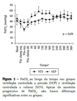 A SvO2 é um indicador de transferência de oxigênio através da membrana capilar dos alvéolos, assim como do débito cardíaco e da utilização periférica de oxigênio. Um valor de SvO2 < 60 mmHg na presença de troca gasosa adequada indica queda do débito cardíaco, alto consumo de oxigênio ou pode refletir uma alteração da relação ventilação/perfusão. O aumento em ΔSO2 pode ser devido a redução na transferência de oxigênio ao nível dos pulmões, queda no transporte de oxigênio aos tecidos ou aumento da utilização tecidual de oxigênio, provavelmente devido às diferentes respostas a drogas vasoativas e ao manejo hemodinâmico.(16) Nas variáveis usadas para monitorar a ventilação, observaram-se grandes elevações dos níveis de PaCO2 e PvCO2 desde o término do transplante. Os valores de PaCO2 e PvCO2 mantiveram-se todo o tempo em níveis superiores no grupo VCV. Dessa forma, com o uso de volumes minuto similares, com menores ajustes de FR e maior Pmédia, os animais do grupo VCP se mantiveram com PaCO2 menores, confirmando um melhor desempenho na habilidade de eliminar o CO2.