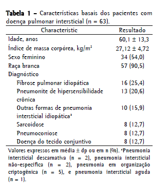 Um total de 63 pacientes com DPI foi incluído no estudo. As características basais dos pacientes são mostradas na Tabela 1. Os diagnósticos mais comuns foram fibrose pulmonar idiopática (FPI) e pneumonite de hipersensibilidade crônica. O diagnóstico de DPI foi feito com base em critérios clínicos e radiológicos em 44,4% dos pacientes, resultados da biópsia pulmonar a céu aberto em 36,5%, resultados da biópsia transbrônquica em 15,9% e resultados da biópsia mediastinal em 3,2%.