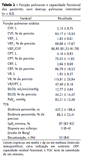 Com relação à gravidade do comprometimento da função pulmonar, a restrição se mostrou leve em 21 pacientes (33,3%), moderada em 11 (17,5%) e grave em 6 (9,5%). Como se pode ver na Tabela 2, encontrou-se redução da DLCO em 51 pacientes (81,0%). A média do VR foi de 115,81 ± 25,94% do previsto, e a média da CPT foi de 75,53 ± 11,82% do previsto; portanto, a relação VR/CPT ficou levemente elevada (47,40 ± 9,18  L). A média da distância percorrida no TC6 foi de 437,2 ± 108,4 m, e 84,1% dos pacientes apresentaram dessaturação significativa durante o TC6.