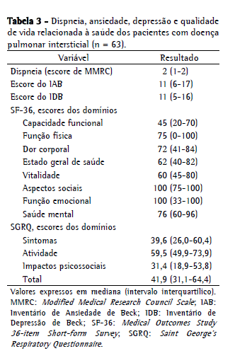Outro grupo de autores empregou o SGRQ para avaliar e identificar fatores relacionado à QVRS de pacientes com FPI.(3) Na análise de regressão linear múltipla, o escore da dispneia (índice de dispneia basal) foi o fator que mais contribuiu para explicar a variância na QVRS desses pacientes. Entretanto, os autores não investigaram a influência da ansiedade e da depressão sobre a QVRS. Em outro estudo, envolvendo pacientes com sarcoidose, uma associação moderada, mas significativa, foi encontrada entre a depressão e o escore do domínio saúde mental do SF-36 (r = 0,58; p < 0,001).(6) Nesse estudo, o grau de dispneia não contribuiu significativamente para a QVRS. Entretanto, variáveis como a distância percorrida no TC6, a DLCO, a CPT e a ansiedade não foram consideradas na análise.