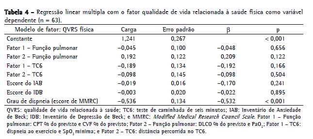 A Tabela 4 mostra a análise de regressão linear múltipla com o fator QVRS física como variável dependente. O valor de p indica quais variáveis se correlacionaram significativamente. A variável que mais contribuiu para o fator QVRS física foi o grau de dispneia (p < 0,001; β = −0,532).