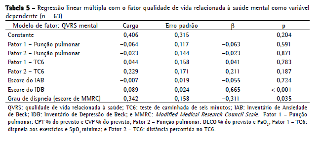 Na análise de regressão linear múltipla, as variáveis independentes foram fatores 1 e 2 para provas de função pulmonar, TC6, grau de dispneia (escore de MMRC), nível de ansiedade (escore do IAB) e gravidade da depressão (escore do IDB). As Tabelas 4 e 5 mostram o modelo de regressão linear múltipla.