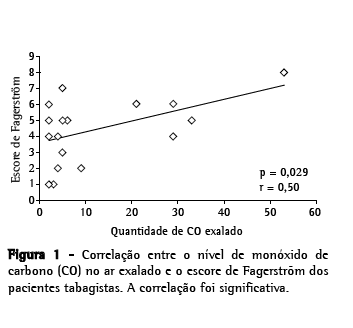 O nível de COex se correlacionou de maneira significativa com o escore de Fagerström (r = 0,50; p = 0,029) (Figura 1).