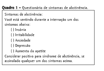 Se o paciente referisse ser tabagista atual, era questionado sobre a carga tabágica, grau de dependência à nicotina pelo teste de Fagerström,(10) questionário de sintomas respiratórios derivado do 2006 Global Initiative for Chronic Obstructive Lung Disease,(11) questionário de sintomas de abstinência utilizado no ambulatório de tabagismo do HSPE-SP, modificado de West (Quadro 1)(12) e mensuração de monóxido de carbono no ar expirado (COex) por técnica padronizada (aparelho Micro Medical Ltd., Rochester, Kent, Reino Unido). Valores acima de 6 ppm de COex foram considerados significantes para tabagismo recente.(13,14)