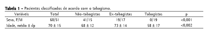Os fumantes atuais tinham menor idade do que os ex-fumantes e não-fumantes (Tabela 1). Nas amostras com predomínio de pacientes geriátricos é comum que se encontre maior proporção de ex- e não-fumantes.