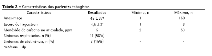 Os 19 fumantes atuais eram do sexo masculino, tinham menor idade (58 ± 17 anos) em comparação aos não-fumantes (68 ± 12 anos) e ex-fumantes (73 ± 14 anos)-ANOVA: F = 6,57 (p = 0,002); e fumaram em média 43 anos-maço. A média do escore de Fagerström foi de 5,0 (variação, 1-8). Dos fumantes, 11 (58%) tinham sintomas respiratórios, e 3 (15%) tinham sintomas de abstinência. A mediana do COex nos fumantes atuais foi de 5,0 ppm (variação, 2-53 ppm). Dos 19 fumantes, 8 (7% do total da amostra) tinham níveis de COex ≥ 6 ppm (Tabela 2).