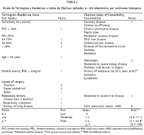 We concluded that, in this series of 305 lobectomies for lung cancer, lower values of FEV1, FEV1/FVC and BMI were associated with a greater number of complications. The Torrington & Henderson scoring system and the Charlson index were useful in the classification of the patients with greater risk of complications and death, and prolonged air leak through drains was the principal determinant of mortality.