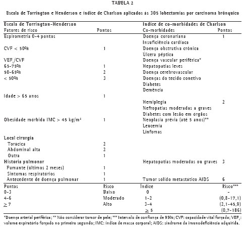 Torrington e Henderson (PORT),(10) para definir grupos de risco para complicações respiratórias, e o índice de Charlson,(11) para identificar grupos de risco para complicações e mortalidade pós-operatórias conforme as co-morbidades (Tabela 2).