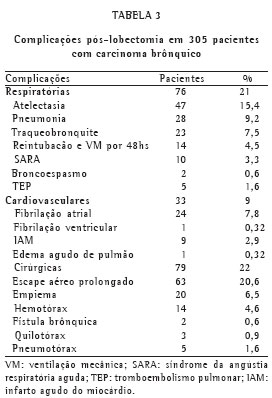 As complicações pós-cirúrgicas em carcinoma brônquico estão relacionadas a vários fatores, incluindo o tipo de ressecção realizada. Alguns autores,(5) ao analisarem os fatores relacionados à morbidade pós-operatória, demonstraram que a ressecção da parede torácica ou diafragma e a broncoplastia são fatores que aumentam o índice de complicações. O presente estudo avaliou o impacto das co-morbidades no pós-operatório numa amostra de lobectomias com ressecção exclusiva do parênquima pulmonar.
