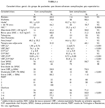 A análise univariada revelou que sexo e hábito tabágico não apresentaram diferenças significativas na incidência de complicações pós-operatórias. A idade superior a 70 anos também não apresentou impacto significativo, sendo 65 anos a idade média dos que apresentaram complicações. Dentre os que apresentaram complicações (Tabela 4), o IMC médio foi significativamente menor e os valores de VEF1 absoluto, percentual e a relação VEF1/CVF foram mais baixos.