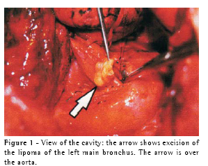 CASE REPORT A 66-year-old patient was referred to the thoracic surgery outpatient clinic for investigation of recurrent episodes of pneumonia for two years. Upon clinical and physical examination, the patient presented good general condition, mild dyspnea, normal skin color and normal blood gas analysis. In the thorax, the patient presented underlying fluid density and reduced breath sounds in the left lung base. A simple chest X-ray, taken upon admission, revealed left lower lobe opacity, with reduced lung volume and left mediastinal deviation, partial left lower lobe atelectasis and scoliosis of the thoracic vertebrae. A computed tomography scan of the chest revealed a low density image, characteristic of fat and obstructing the left main bronchus. The diagnostic hypothesis was recurrent pneumonia due to the bronchial obstruction caused by a lesion with fat density suggestive of lipoma.