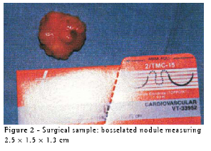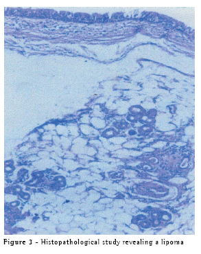 The treatment chosen was left thoracotomy followed by bronchotomy to excise the lesion, interrupted bronchial suture with separate stitches (using polypropylene sutures) and chest wall closure (Figure 1). The surgical sample removed presented a yellowish nodule of elastic consistency with bosselated areas (Figure 2). Under microscopy, we found bronchial mucosa presenting, in the chorion, a tumor formed of mature adipose tissue with glands belonging to the region proper (Figure 3). The postoperative period was uneventful. The patient was discharged on the seventh postoperative day and was asymptomatic after four years of outpatient follow-up.