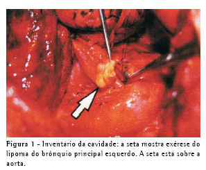 Uma paciente de 66 anos foi encaminhada ao ambulatório de cirurgia torácica para investigação de quadros pneumônicos de repetição, iniciados havia cerca de dois anos. Ao exame clínico e físico, a paciente encontrava-se em bom estado geral, levemente dispnéica, normocorada, com gasometria arterial normal. No tórax apresentava submacicez e murmúrio vesicular diminuído em base esquerda. A radiografia simples de tórax, na admissão, mostrava hipotransparência lobar inferior esquerda, com redução volumétrica e desvio mediastinal para esse lado, atelectasia parcial lobar inferior esquerda e escoliose das vértebras torácicas. A tomografia computadorizada de tórax mostrou imagem de baixa densidade, sugestiva de gordura, ocupando a luz brônquica, ao nível do brônquio principal esquerdo. A hipótese diagnóstica foi de pneumonias de repetição devido obstrução brônquica causada por uma lesão com densidade de gordura sugestiva de lipoma.