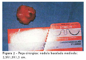 A peça cirúrgica retirada mostrava um nódulo de consistência elástica, amarelado, com áreas de bocelamento (Figura 2).