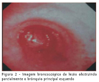 A broncoscopia revelou uma lesão vegetante, pediculada e obstrutiva, de aproximadamente 2 cm de diâmetro, no brônquio principal esquerdo (Figura 2).