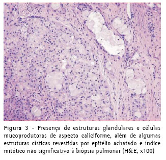 O exame histopatológico do segmento ressecado revelou lesão constituída predominantemente por estruturas glandulares e células mucoprodutoras de aspecto caliciforme, com ausência de atipias citológicas importantes e índice mitótico significativo, característica de carcinoma mucoepidermóide endobrônquico variante baixo grau (Figura 3). A paciente tem-se apresentado assintomática, e sem evidências de recidiva a partir de controle por tomografia computadorizada de alta resolução e broncoscopia semestrais.