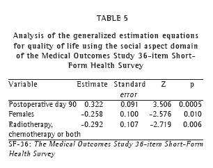 In the analysis of the preoperative period and the three phases of evaluation of the postoperative period, patients presented improved QoL in the social aspect domain from postoperative day 90 onward (p < 0.0005). Females presented lower QoL than that observed for males (p < 0.010). Patients submitted to radiotherapy, chemotherapy or both also presented lower QoL (p < 0.06) (Table 5).
