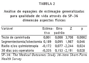 Na dimensão aspectos físicos, a melhora da QV foi estatisticamente significativa quanto melhor o desempenho do paciente para realização do teste de caminhada (p < 0,0002) e quanto menor a ressecção do parênquima pulmonar (p < 0,04), como se observa na Tabela 2.