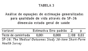Contrariamente, alguns autores observaram que os resultados obtidos na aplicação de radioterapia e/ou quimioterapia, em doze pacientes de câncer de tórax, não evidenciaram piora na QV ou na função pulmonar.(25) Quanto à avaliação da função pulmonar, a variação da mediana para a CVF no período entre o pré-operatório e seis meses após a cirurgia foi de 98,5 ± 18,0% para 81,5 ± 23,3%. Quando aplicada a análise estatística através das GEE, a CVF foi preditora de melhora da qualidade de vida na dimensão capacidade funcional (p < 0,011). Porém, outros autores não encontraram associação do SF-36 com a função pulmonar.(21,26) No TC a distância percorrida no pré-operatório foi de 509 ± 99,5 metros e após seis meses da cirurgia, de 506 ± 95,1 metros. Quando aplicadas as GEE, observou-se que o TC foi preditor de melhora da QV na dimensão capacidade funcional (p < 0,0003), aspectos físicos (p < 0,0002) e estado geral de saúde (p < 0,03).