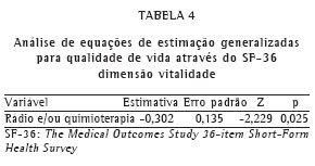 Quando se analisou a dimensão vitalidade, observou-se que o uso de tratamento com radioterapia e/ou quimioterapia se associou a piora da qualidade de vida (p < 0,025) (Tabela 4).