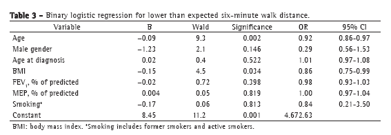 Binary logistic regression analysis was performed with the enter method in order to identify predictors of lower 6MWD. Variables were selected on the basis of univariate analysis, those with a p value < 0.1 and no collinearity (adjusted for gender and age) having been entered into the model.