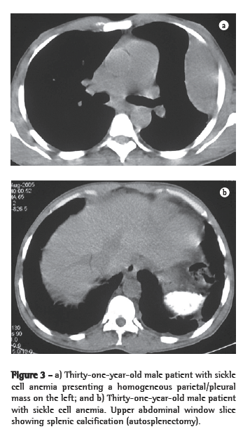 On CT scans, masses with dense soft parts, usually homogeneous, with characteristics similar to those described using conventional radiology,(1,2,5,6) and which might or might not be highlighted after administration of contrast material,(4,10) can be seen. This imaging method is important for analyzing the internal structure of the lesions, especially of those that are rich in fat,(5) in order to identify other paracostal masses, and for detecting bone alterations associated with certain hematologic diseases, such as thalassemia and sickle cell anemia.(6) In cases related to thalassemia, sickle cell anemia, or myeloid metaplasia, there can be widening of the medullary cavities of the ribs.(5) All of those aspects were identified in our cases. It is of note that two patients presented calcifications in the spleen, resulting from multiple infarcts, with autosplenectomy. Both of those patients had sickle cell anemia. This finding can also facilitate the differential diagnosis.