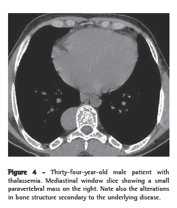 In one study,(6) the changes in the density of the paravertebral masses in a patient submitted to 5-year follow-up evaluation were monitored by CT scans. Initially, the masses presented dense soft parts, later (after splenectomy) undergoing adipose changes. This transformation was attributed to the resolution of the hemolytic disease and to the disappearance of the stimulus that favors the formation of hematopoietic tissue.