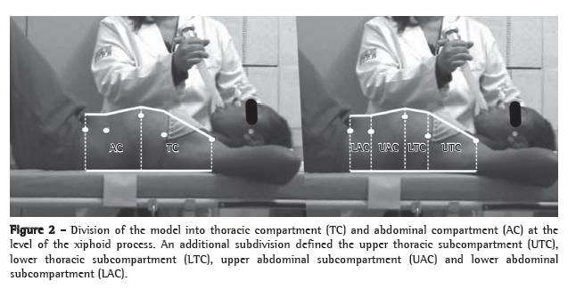 After the initial tests, flat spherical surface markers (13 mm in diameter) were placed at the following locations: (1) anterior superior iliac spine; (2) lateral to the umbilicus; (3) the lower angle of the 10th rib cartilage; (4) lateral to the xiphoid process; and (5) lateral to the jugular notch of the sternum. These points served as landmarks for the geometrical delineation of the thoracoabdominal compartments in the images acquired during the IVMs. The final tracing resulted in an adaptation of the BAMER model for the supine position.(11)