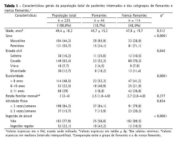 Nessa população, a prevalência de tabagistas, de ex-tabagistas e daqueles que referiram nunca ter fumado na vida foi de 18,7%, 32,8% e 48,5%, respectivamente. A prevalência de tabagismo passivo foi elevada (46,7%). A maioria dos participantes era do sexo feminino (n = 131; 55,7%) e casada (n = 149; 63,4%). A média de idade foi de 49,4 ± 18,2 anos. Quase metade da amostra era analfabeta ou possuía o ensino fundamental incompleto. A renda familiar teve como mediana 3 salários mínimos. A maioria dos pacientes não praticava atividade física regularmente e não costumava ingerir bebidas alcoólicas regularmente (84,3% e 77,9%, respectivamente; Tabela 1).