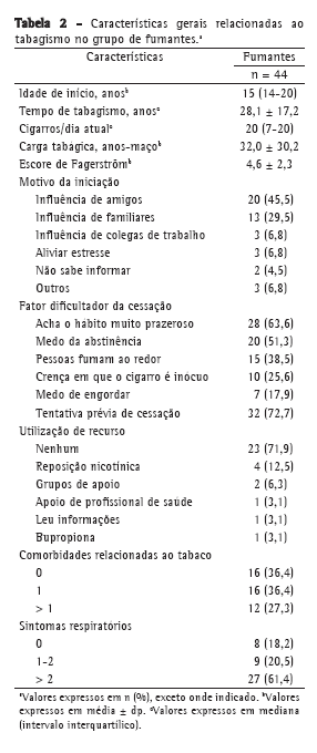 Considerando-se especificamente as características do tabagismo nesta população, observou-se que a mediana de idade de início foi de 15 anos. A média do tempo de tabagismo era de 28,1 ± 17,2 anos, com média de carga tabágica de 32,0 ± 30,2 anos-maço e mediana diária de consumo de 20 cigarros/dia (Tabela 2).