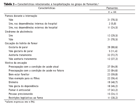 A maioria dos entrevistados (70,5%) revelou não ter fumado durante a internação, e 13 deles (29,5%) apresentaram síndrome de abstinência de nicotina. Dos fumantes, 39 (88,6%) manifestaram o desejo de cessar definitivamente o hábito de fumar, enquanto 32 (72,7%) afirmaram que aceitariam receber tratamento durante a hospitalização. Os principais motivos pelos quais os pacientes tinham o desejo de parar de fumar foram a preocupação com a condição atual de saúde, em 94,9%; a preocupação com a saúde que pode vir a adquirir no futuro, em 84,6%; o desejo de melhorar o bem-estar familiar, em 59,0%; e o fato de que o tabagismo é um mau exemplo para os filhos, em 56,4% (Tabela 3).