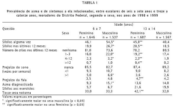 Na faixa etária de treze a catorze anos, foram avaliados 1.567 adolescentes do sexo masculino (48,2%) e 1.687 do sexo feminino (51,8%). As meninas tiveram prevalência significativamente maior de sibilos alguma vez, sibilos no último ano, maior prejuízo da fala e mais tosse seca sem a presença de infecção concomitante. Quanto ao diagnóstico de asma, não houve diferença estatisticamente significativa entre os sexos. Estes dados podem ser observados na Tabela 1.