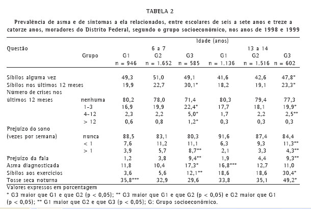 Em relação aos grupos socioeconômicos, encontraram-se, na faixa etária de seis a sete anos, prevalências significativamente maiores de alguns sintomas de asma na população socioeconomicamente menos favorecida, como sibilos nos últimos doze meses, maior número de crises no último ano, maior prejuízo do sono e da fala, chiado aos exercícios e asma diagnosticada. Na faixa etária de treze a catorze anos, encontrou-se, na população menos favorecida, número significativamente maior de sintomas, como sibilos alguma vez, sibilos no último ano, maior prejuízo do sono e da fala, chiado aos exercícios e tosse seca noturna (Tabela 2).