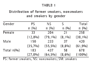 Ages ranged from 24 to 84, with a mean of 43.40 ± 10.86 years. The sample consisted of 437 nonsmokers, 183 former smokers and 58 smokers. Table 1 shows that, based on the results of the chi-square test, there was a statistically significant correlation between gender and smoking (p < 0.0001), the number of nonsmokers being higher among males.