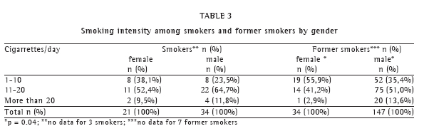 Table 3 shows smoking intensity by gender and reveals that most of the men smoked eleven to twenty cigarettes per day, whereas most of the women were smoked one to ten cigarettes per day (p = 0.04). Smoking intensity measured in pack-years was also greater among men than among women. Men smoked for 15.81 ± 15.23 pack-years versus 10.09 ± 11.95 pack-years for women (p = 0.003).