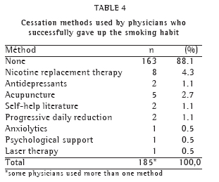 It is known that 90% of smokers who abandon the habit do so without the aid of any cessation methods. There have been no studies analyzing the smoking cessation methods used by physicians in Brazil. Nor have there been any recent studies on the prevalence of smoking among physicians practicing in the state of São Paulo.