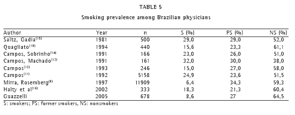 Taking into account these last studies, we observe that the smoking prevalence among Brazilian physicians is close to that found among physicians in countries such as the USA, England and Canada,(17-18) all of which present rates lower than 10%, and much lower than the rates found in Japan, Holland, Mexico and Spain.(18-23)