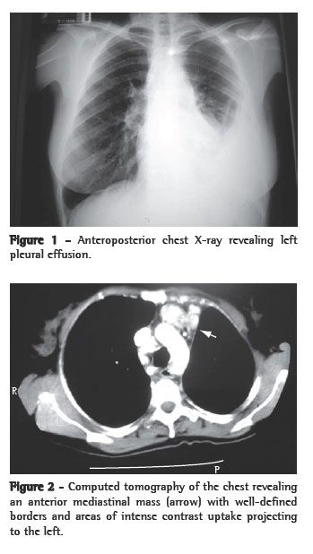 The physical examination revealed that the patient presented good general health status (lymph nodes were not palpable). The left inferoposterior third of the chest was rigid, with absent breath sounds upon auscultation. Pleural fluid testing (thoracocentesis) revealed the following: 25% neutrophils; 70% lymphocytes; 5% macrophages; few erythrocytes; absence of neoplastic cells; glucose, 102 mg/dL; total proteins, 5.5 g/dL; lactate dehydrogenase, 264 U/L; and pH, 7.45. No acid-fast bacilli were found in the direct examination of the pleural fluid, and a culture was negative for Mycobacterium ­tuberculosis. A pleural biopsy revealed chronic nonspecific pleuritis with mild fibrosis. The induration diameter on the purified protein derivative skin test was 30 mm, and the serology was negative for HIV-1 and HIV-2. In view of the diagnosis of probable pleural tuberculosis, treatment with regimen I (rifampicin, isoniazid, and pyrazinamide) was instituted. After 6 months of treatment, there was no resolution of the left pleural effusion volume, although the patient remained free of respiratory complaints. Computed tomography of the chest revealed a left anterior mediastinal mass with well-defined borders near the heart, with areas of intense contrast uptake (Figure 2), in addition to the left pleural effusion.