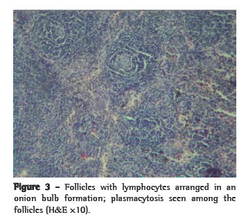 The patient underwent excision of the lymph node and mediastinal mass, which were brownish, firm and pliable. The histopathological study of these specimens (Figure 3) revealed lymphoid tissue consisting of small cells in follicular arrangements, sometimes concentrically arranged, sometimes presenting previously reactive germinal centers and hyalinization of vessel walls; among such follicles, there were numerous cells identifiable as plasmacytes. The immunohistochemical study revealed the following: positivity for CD45 (LCA) and CD20 (Pan B) in the follicle cells; positivity for CD3 (Pan T) in the interfollicular area; positivity for CD45 (LCA) and Bcl-2 in the mantle cells; positivity for CD68 in the macrophages and dendritic cells; and absence of AE1/AE3 expression.