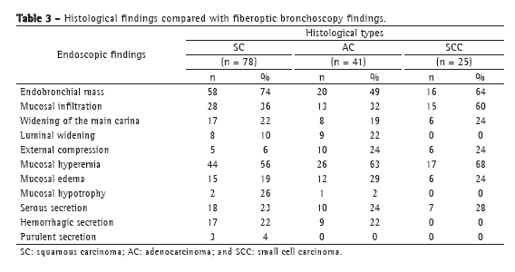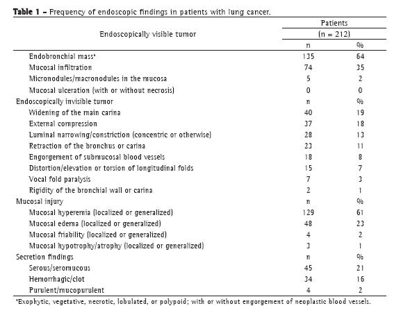 Objective: To compile fiberoptic bronchoscopy findings in patients diagnosed with lung cancer and to correlate those with histopathological findings. Methods: This was a retrospective study involving 212 patients with a confirmed diagnosis of lung cancer by cytological evaluation of BAL specimens or by histopathological evaluation of endobronchial or transbronchial biopsy specimens. The data were collected at the Respiratory Endoscopy Section of Hospital São Salvador, located in the city of Goiânia, Brazil, between 2005 and 2010. The endoscopic findings were classified as endoscopically visible tumor, endoscopically invisible tumor, and mucosal injury, as well as being classified by the presence/type of secretion. The visible tumors were also classified according to their location in the tracheobronchial tree. Results: Endobronchial mass (64%) and mucosal infiltration (35%) were the main endoscopic findings. The histological type was determined in 199 cases, the most prevalent types being squamous carcinoma, in 78 (39%), adenocarcinoma, in 42 (21%), small cell carcinoma, in 24 (12%), and large cell carcinoma, in 2 (1%). More than 45% of the visible tumors were at the upper bronchi. Squamous carcinoma (n = 78) was most commonly visualized as an endobronchial mass (in 74%), mucosal infiltration (in 36%), luminal narrowing (in 10%), or external compression (in 6%). Conclusions: Our results show that an endobronchial mass is the most common bronchoscopic finding that is suggestive of malignancy. Proportionally, mucosal infiltration is the most common finding in small cell carcinoma. In adenocarcinoma, luminal narrowing, external compression, mucosal injury, and endobronchial secretion prevail.