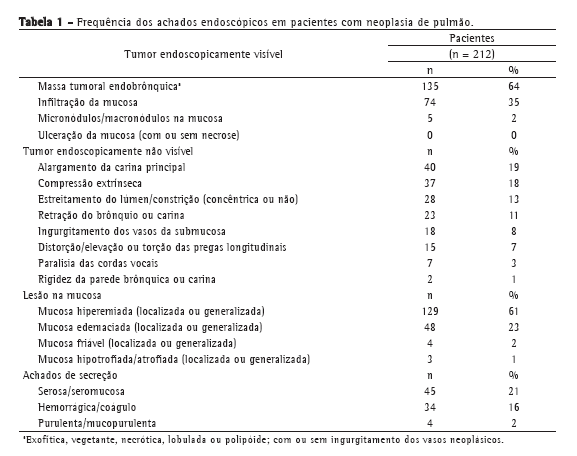 Os achados das lesões endoscópicas foram catalogados de acordo com a classificação proposta por Ikeda et al.(6) (tumor endoscopicamente visível e endoscopicamente não visível), juntamente com alguns critérios utilizados na classificação da Sociedade Japonesa de Câncer de Pulmão,(5,7) a respeito de lesão na mucosa e achados de secreção. Os tumores endoscopicamente visíveis também foram classificados de acordo com sua localização na árvore traqueobrônquica (traqueia, brônquio principal esquerdo, brônquio do lobo superior esquerdo, brônquio do lobo inferior esquerdo, brônquio principal direito, brônquio intermediário, brônquio do lobo superior direito, brônquio do lobo médio e brônquio do lobo inferior direito).